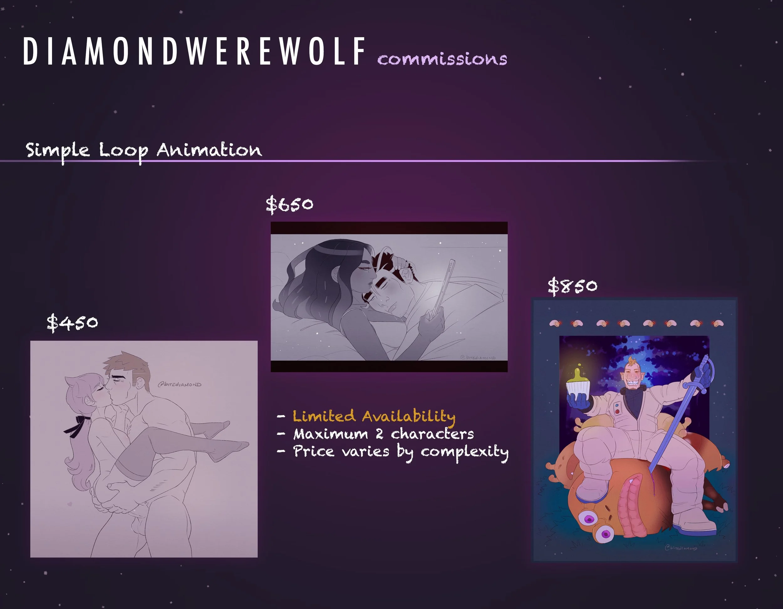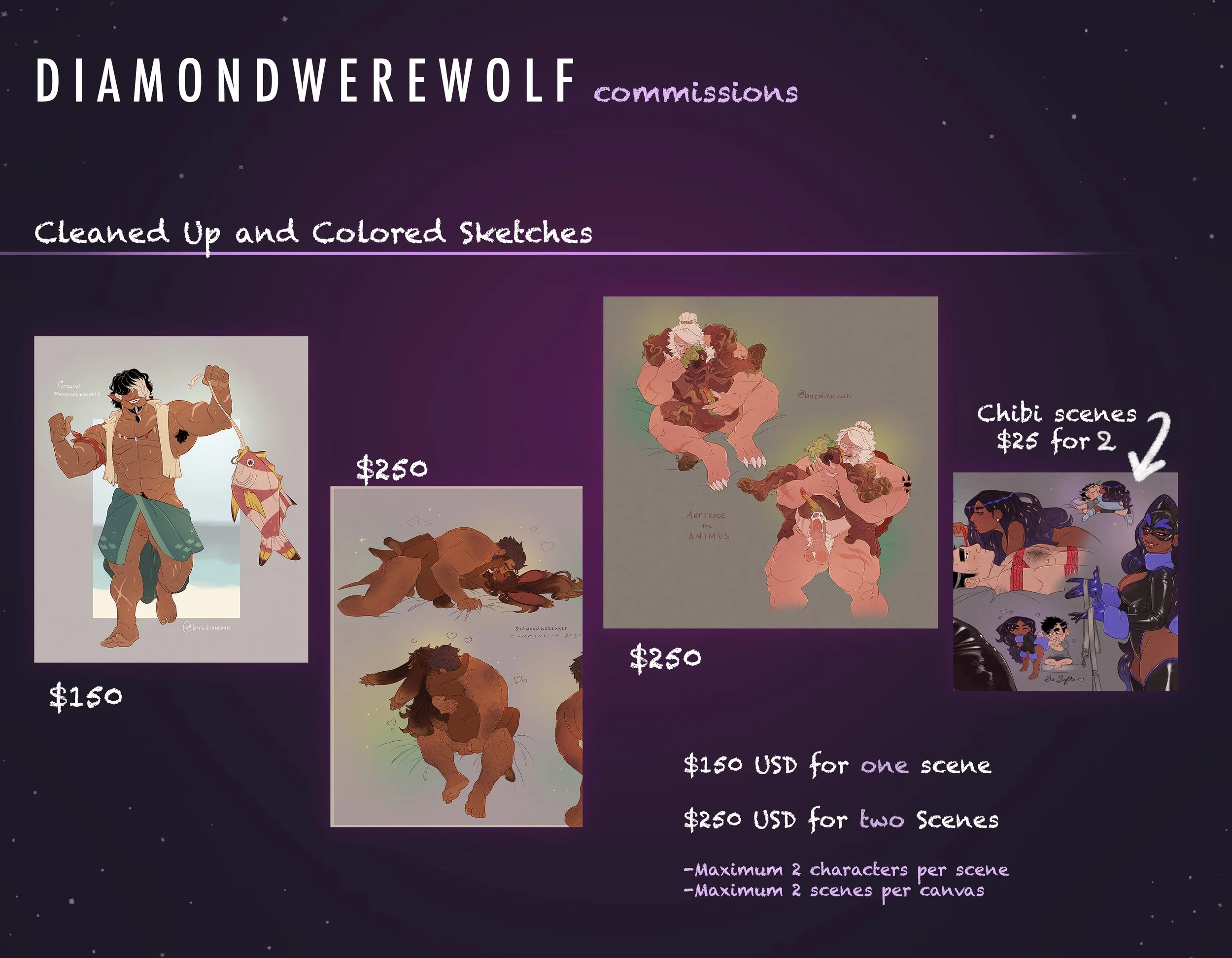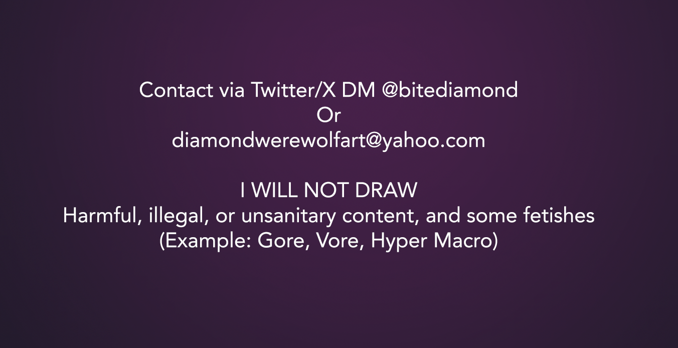 Please message Diamondwerewolfart@yahoo.com for commission inquiries and questions, or you can follow and DM on twitter @bitediamond.